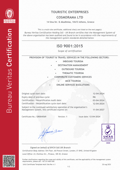 Cosmorama proudly holds a “Quality Assurance Certification”, distinguishing us among Greek travel organizations.