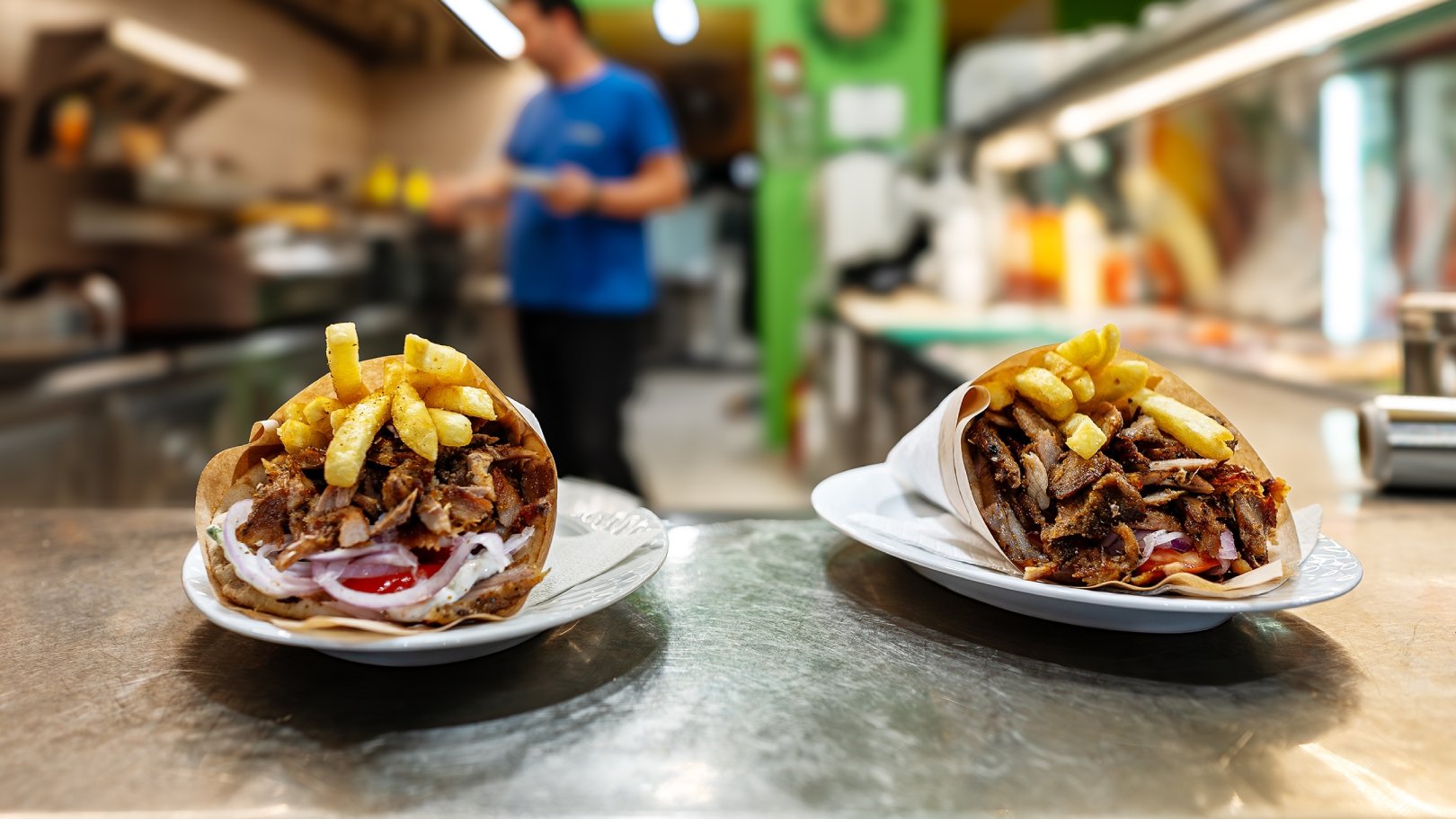 Next, we indulge in an essential part of Greek street food, savoring a souvlaki wrapped in pita bread, accompanied by a refreshing Greek beer.