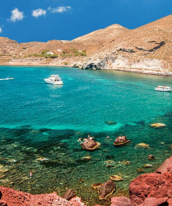 Continue to Palea Kameni for a 30-minute stop near the hot springs, whose sulfur- and iron-rich waters create a natural volcanic spa.